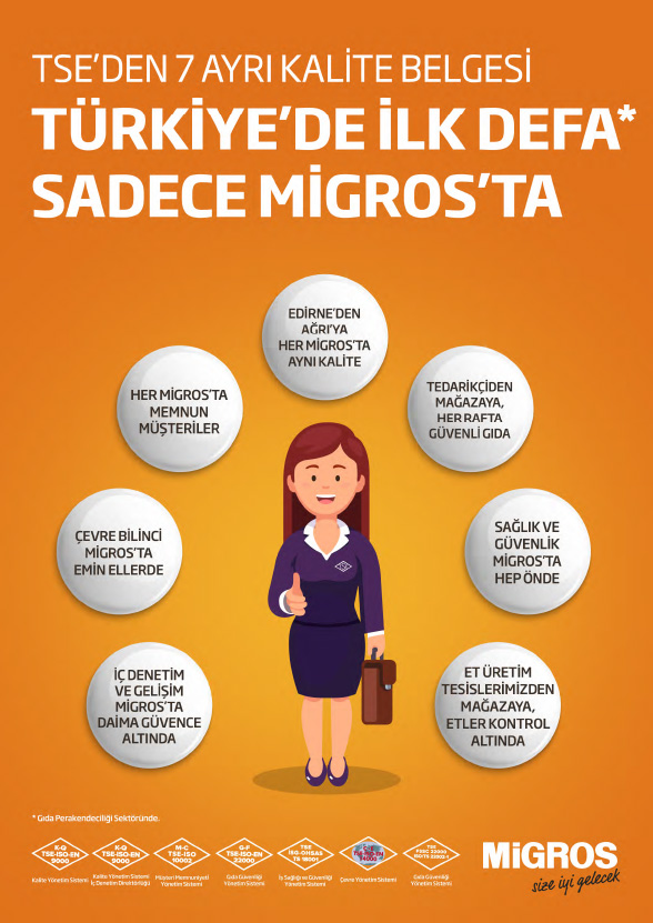 Migros, stratejileri ve misyonu doğrultusunda sürdürülebilir kalite ve sektörel öncülüğü sağlamak üzere; müşterilerine daima modern, güvenilir, ekonomik ve yüksek kalitede hizmet sunmaktadır. Migros, Türk Standartları Enstitüsü tarafından belgelendirilen yedi Kalite Yönetim Sistem Belgesine sahip İlk Gıda Perakendecisidir. Bu belgeler;